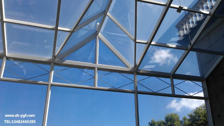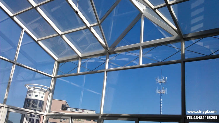 頂面為斜坡+人字頂組合造型,主梁采用50*100*4.5mm;40*80*3.0mm鋼骨架焊接,外包鋁合金裝飾,夾膠雙鋼化玻璃