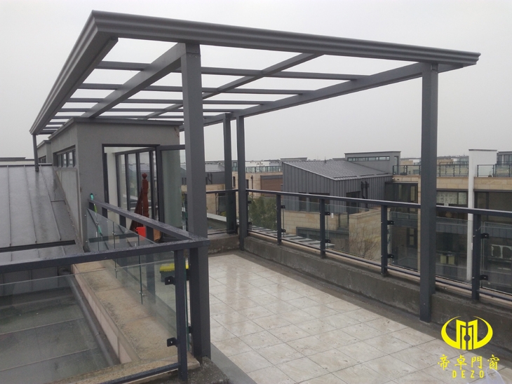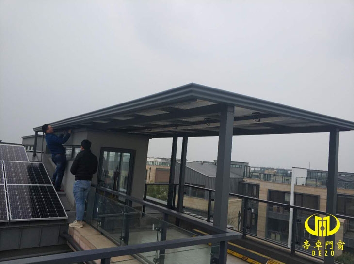 陽光房簡述:該項目為露臺光伏雨棚,頂面覆蓋太陽能光伏板,可以發電自用或者賣電獲得經濟收益,夏天還可以起到遮陽隔熱效果,骨架為3.0mm鋁合金骨架,替代以往光伏常用的輕鋼龍骨之類的,外觀美觀,另外方便后期立面封門窗。
