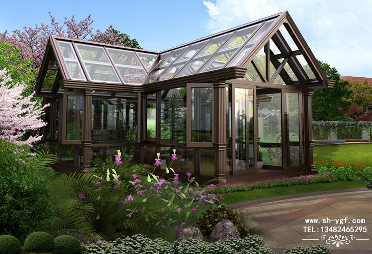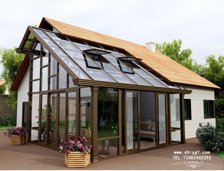 豪華人字頂系列陽光房,羅馬柱式全鋁立柱,鋁合金裝飾線條天溝系統,陽光房頂部開天窗